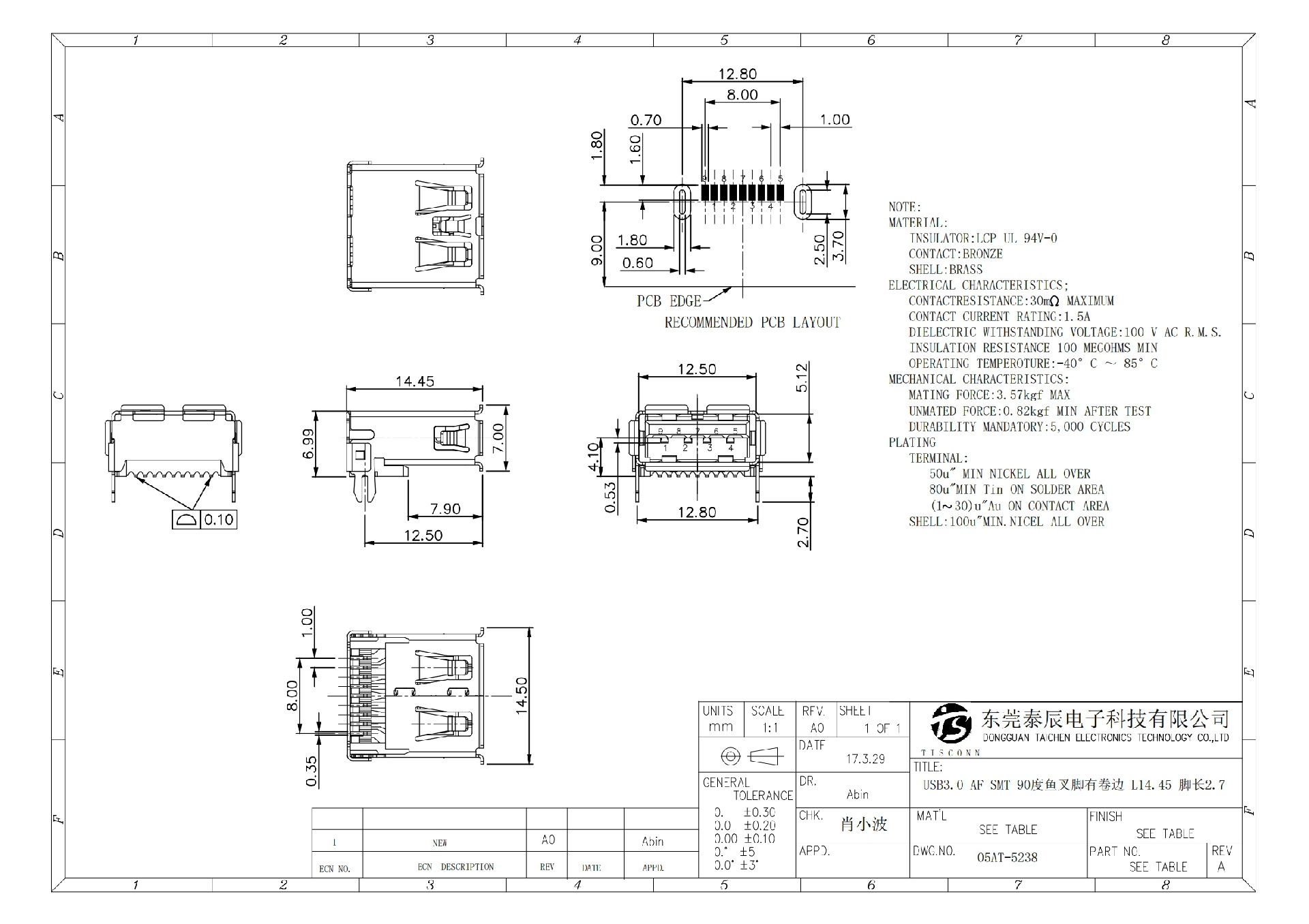 05AT-5238 USB3.0 AF SMT 90度鱼叉脚有卷边 L14.45 脚长2.7
