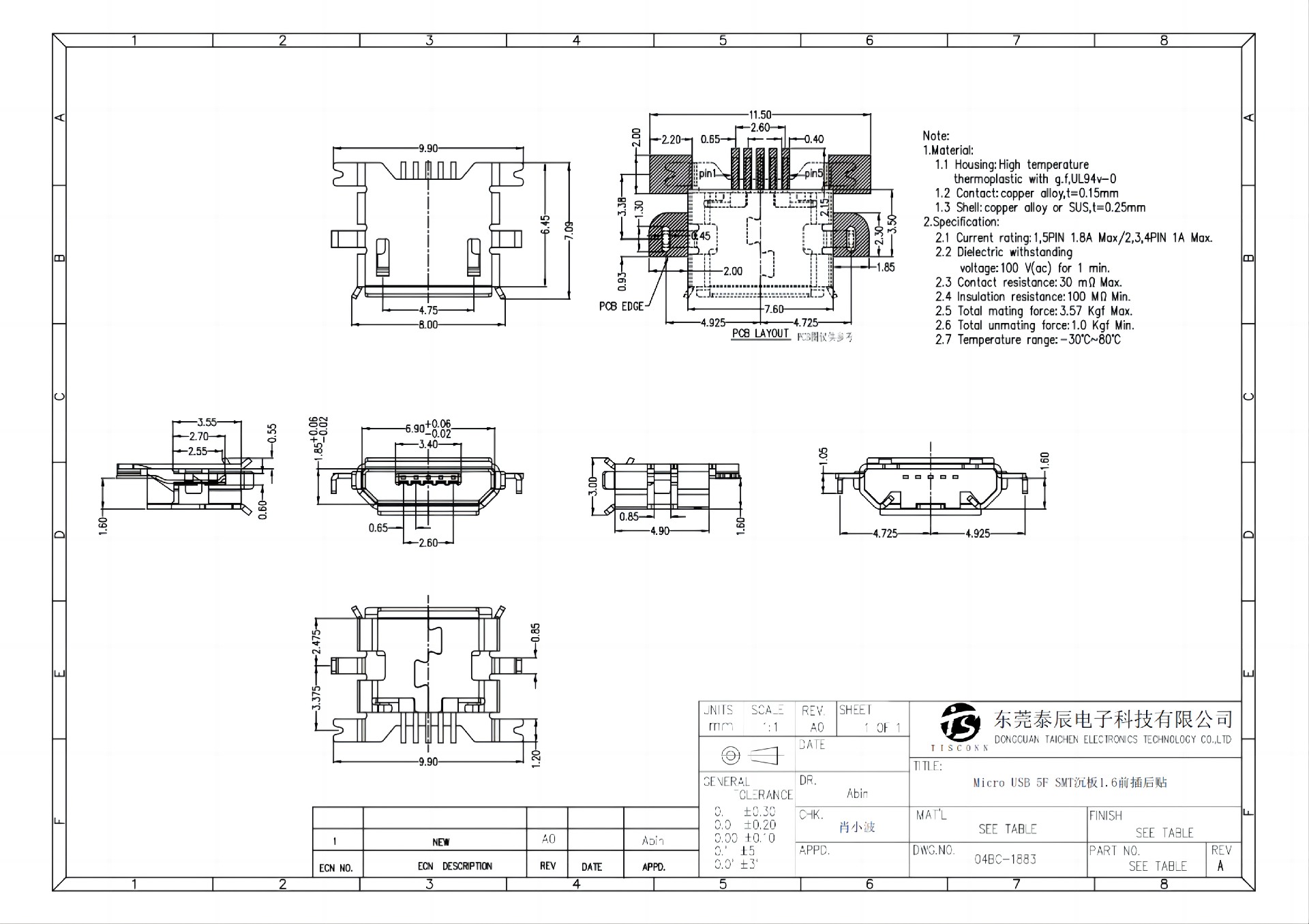 • 04BC-1883   Micro USB 5F SMT沉板1.6前插后贴有卷边