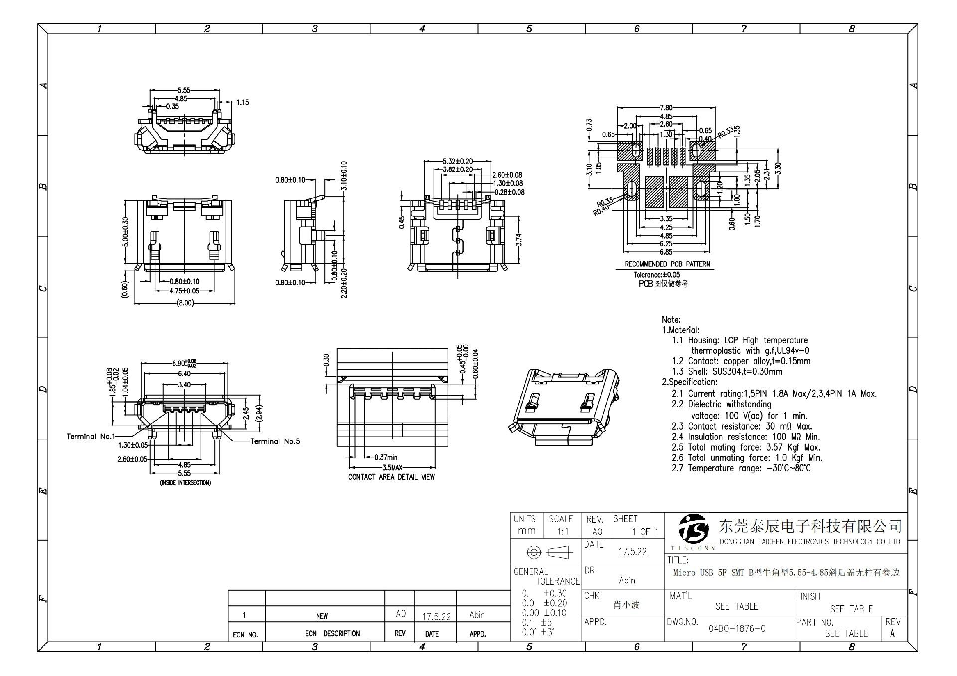 • 04BO-1876-0   Micro USB 5F SMT B型牛角型5.55-4.85斜后盖无柱有卷边