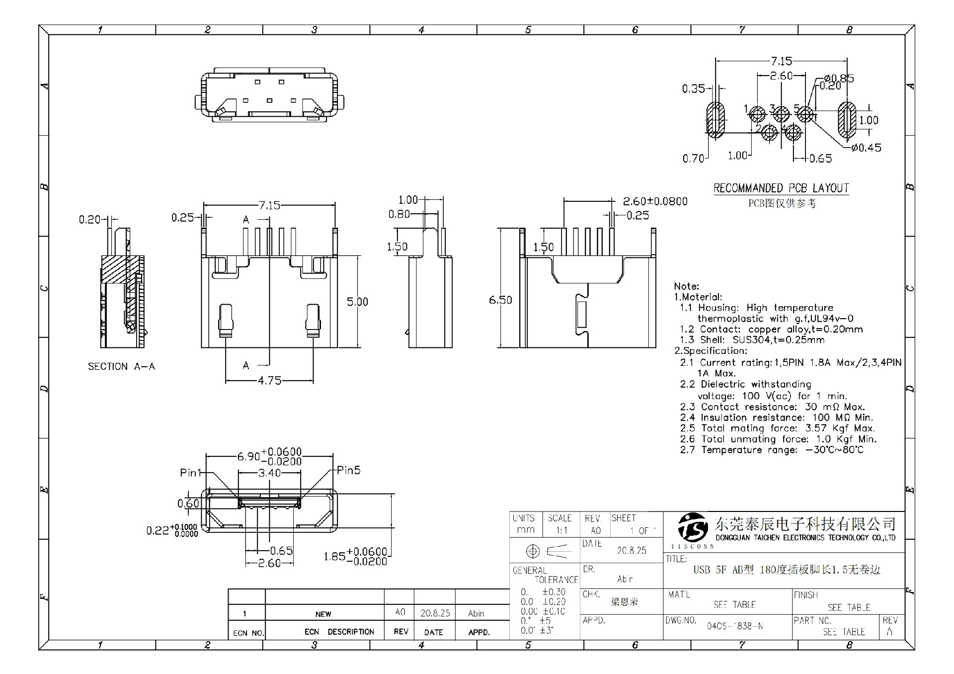 • 04OS-1838-N   Micro USB 5F AB型 180度插板脚长1.5无卷边