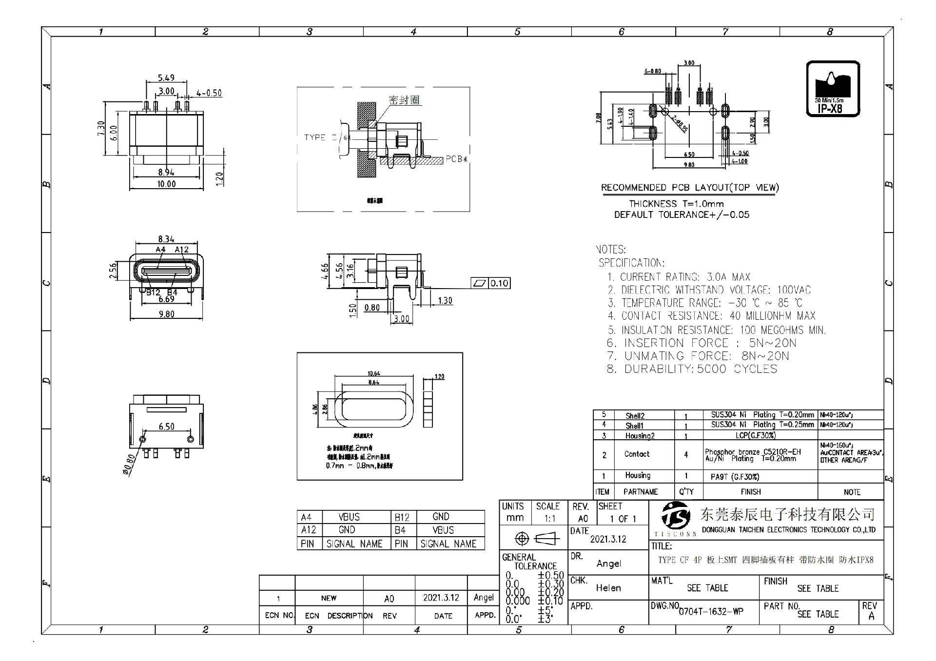 • 0704T-1632-WP   TYPE CF 4P 板上SMT 四脚插板有柱 带防水圈 防水IPX8