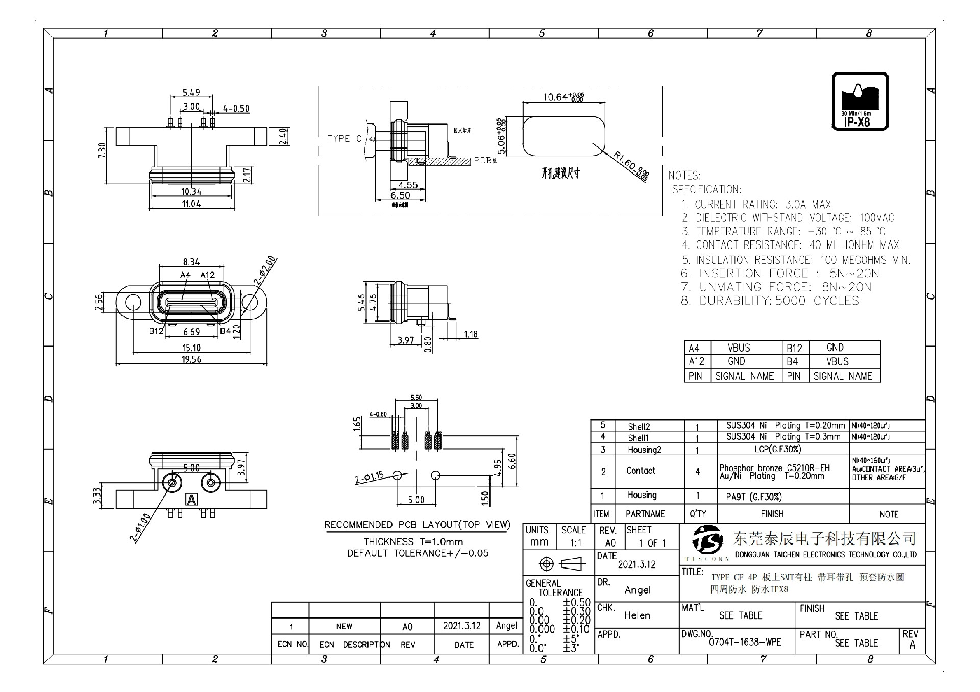 • 0704T-1638-WPE   TYPE CF 4P 板上SMT有柱 带耳带孔 预套防水圈 四周防水 防水IPX8