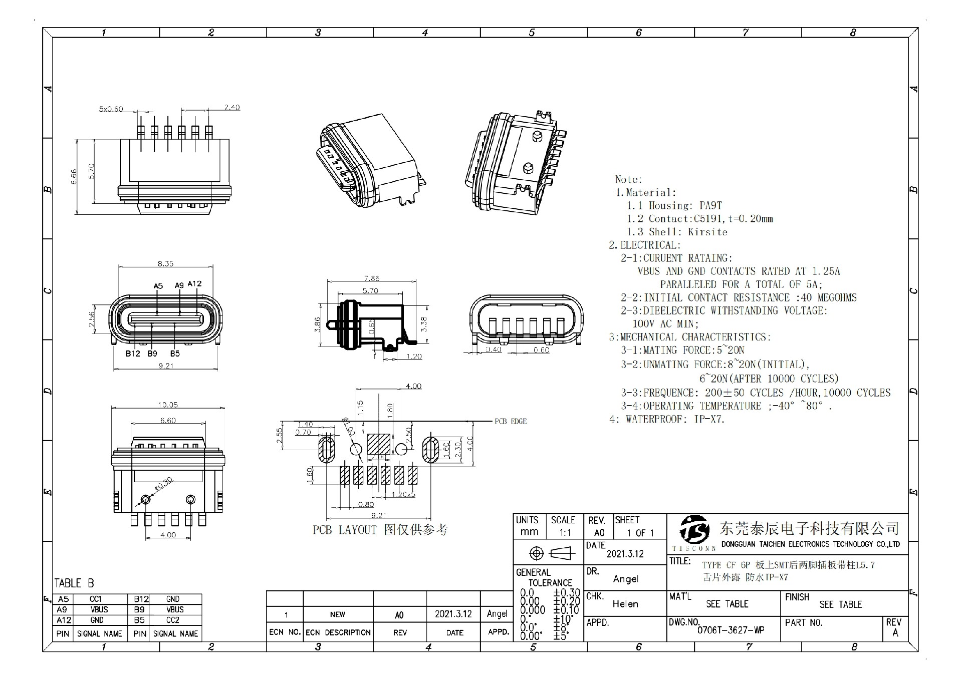 0706T-3627-WP TYPE CF 6P 板上SMT后两脚插板带柱L5.7 舌片外露 防水IP-X7