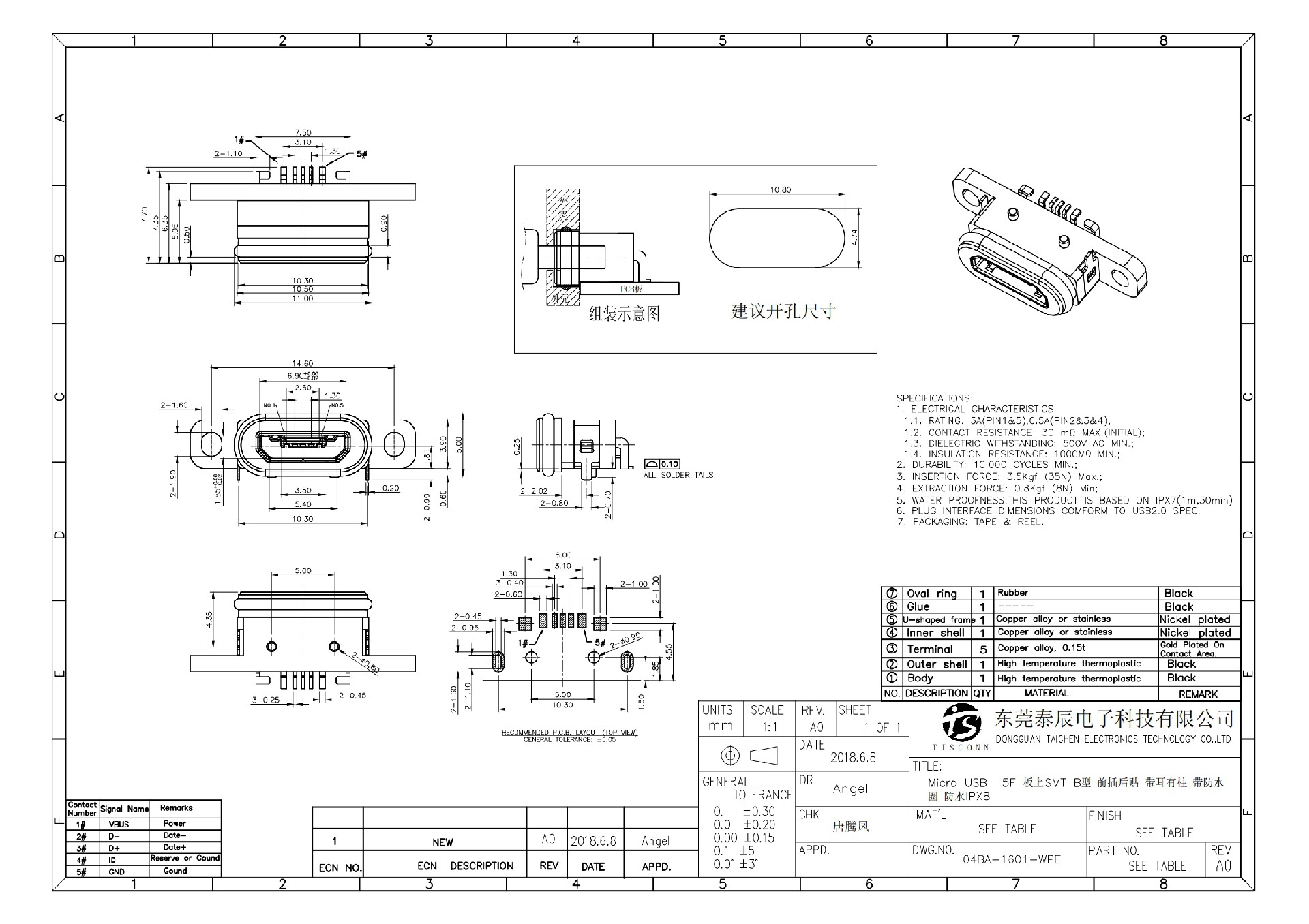 泰辰连接器厂家生产的MICRO USB 5F 板上SMT 前插后贴B型 带柱防水母座广泛应用于手机、充电宝、音箱、蓝牙耳机、MP4、摄像头、行车记录仪、PDA、数码相机、数码摄像机和便携数字播放器等。