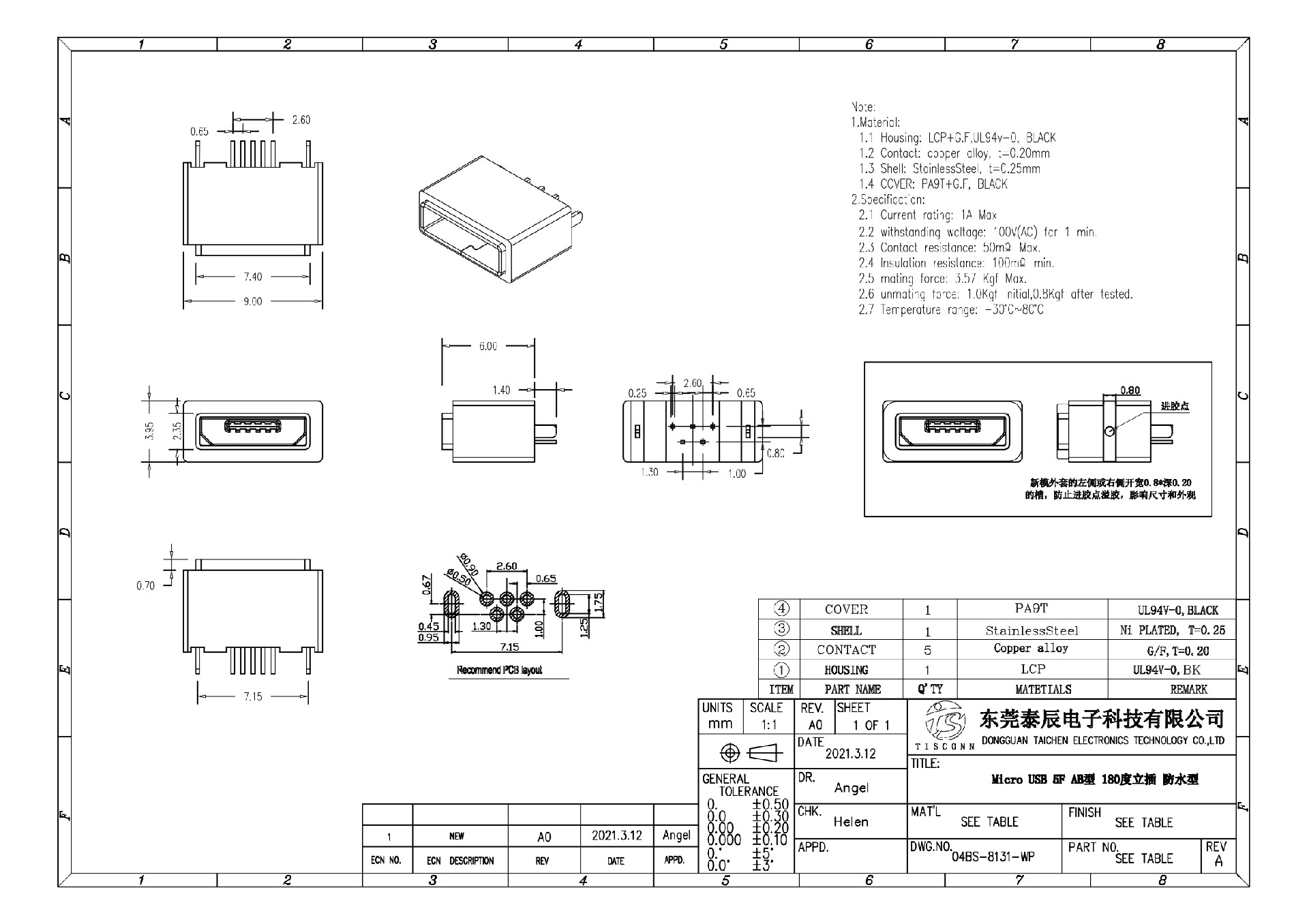泰辰连接器厂家生产的MICRO USB 5F 板上SMT 前插后贴B型 带柱防水母座广泛应用于手机、充电宝、音箱、蓝牙耳机、MP4、摄像头、行车记录仪、PDA、数码相机、数码摄像机和便携数字播放器等。