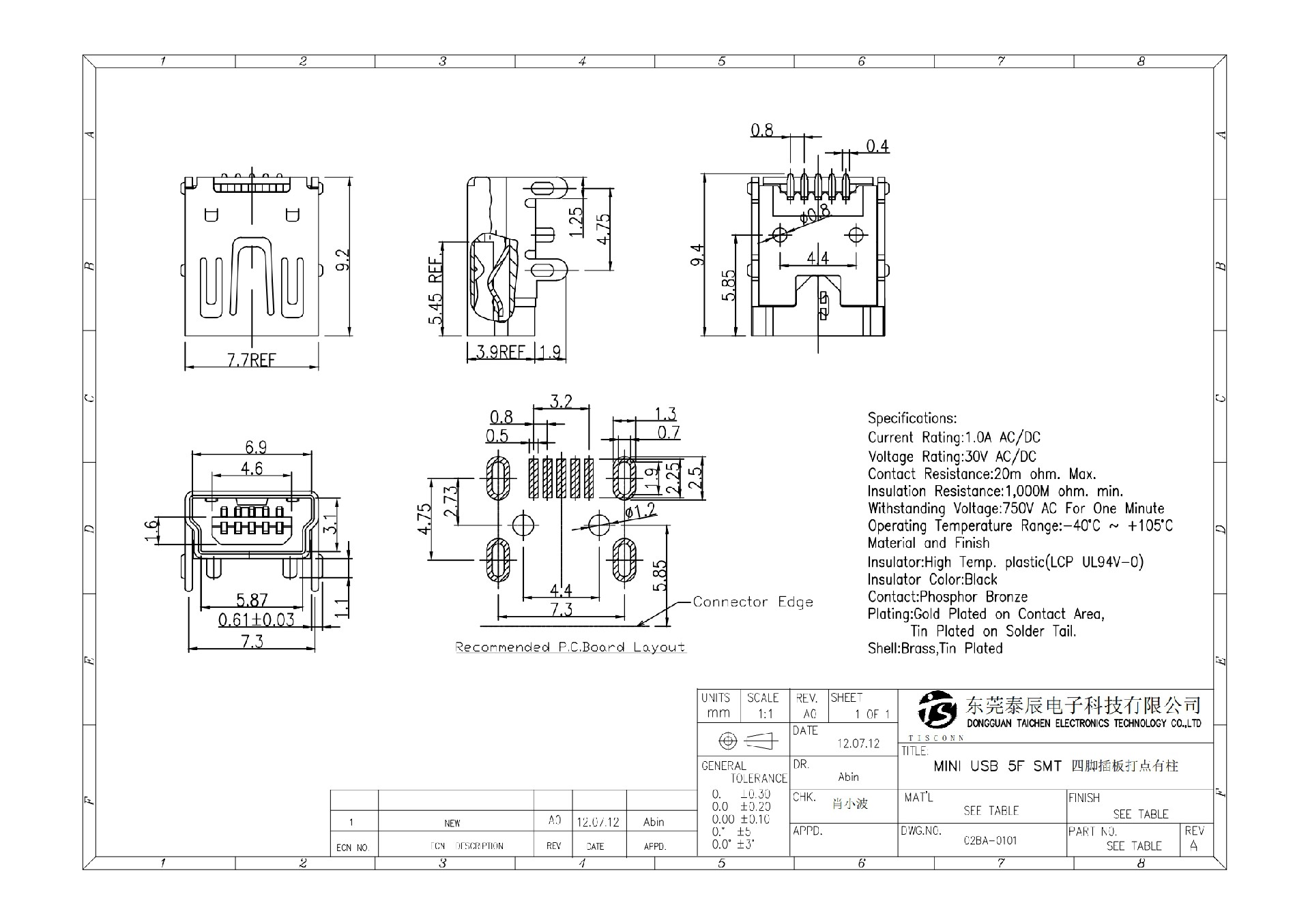 02BA-0103 MINI USB 5F SMT 四脚插板不打点有柱