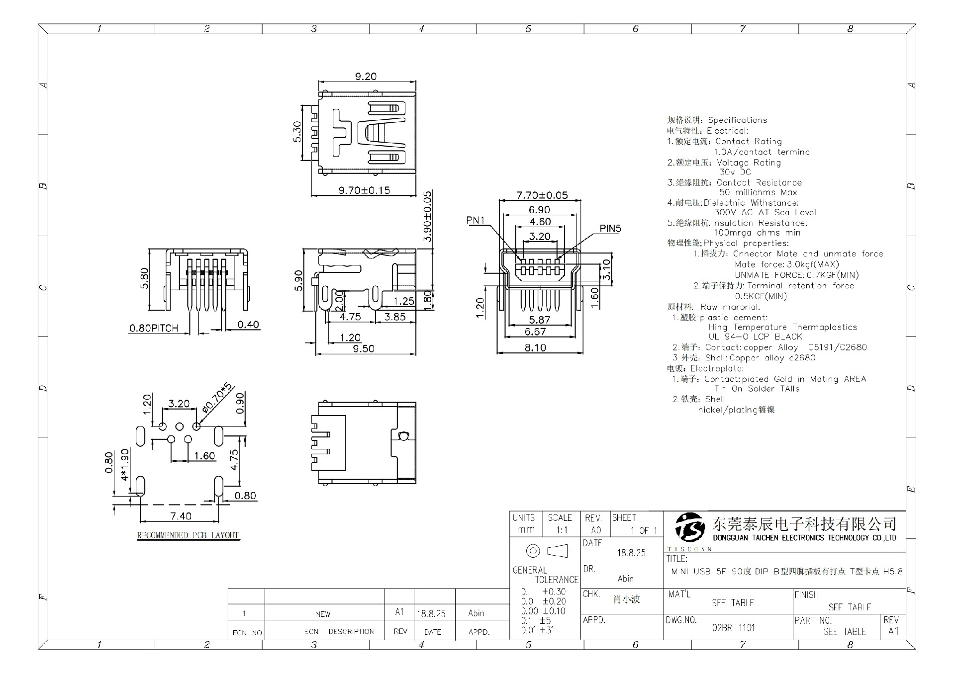 02BR-1101 MINI USB 5F 90度 DIP B型四脚插板有打点 T型卡点 H5.8