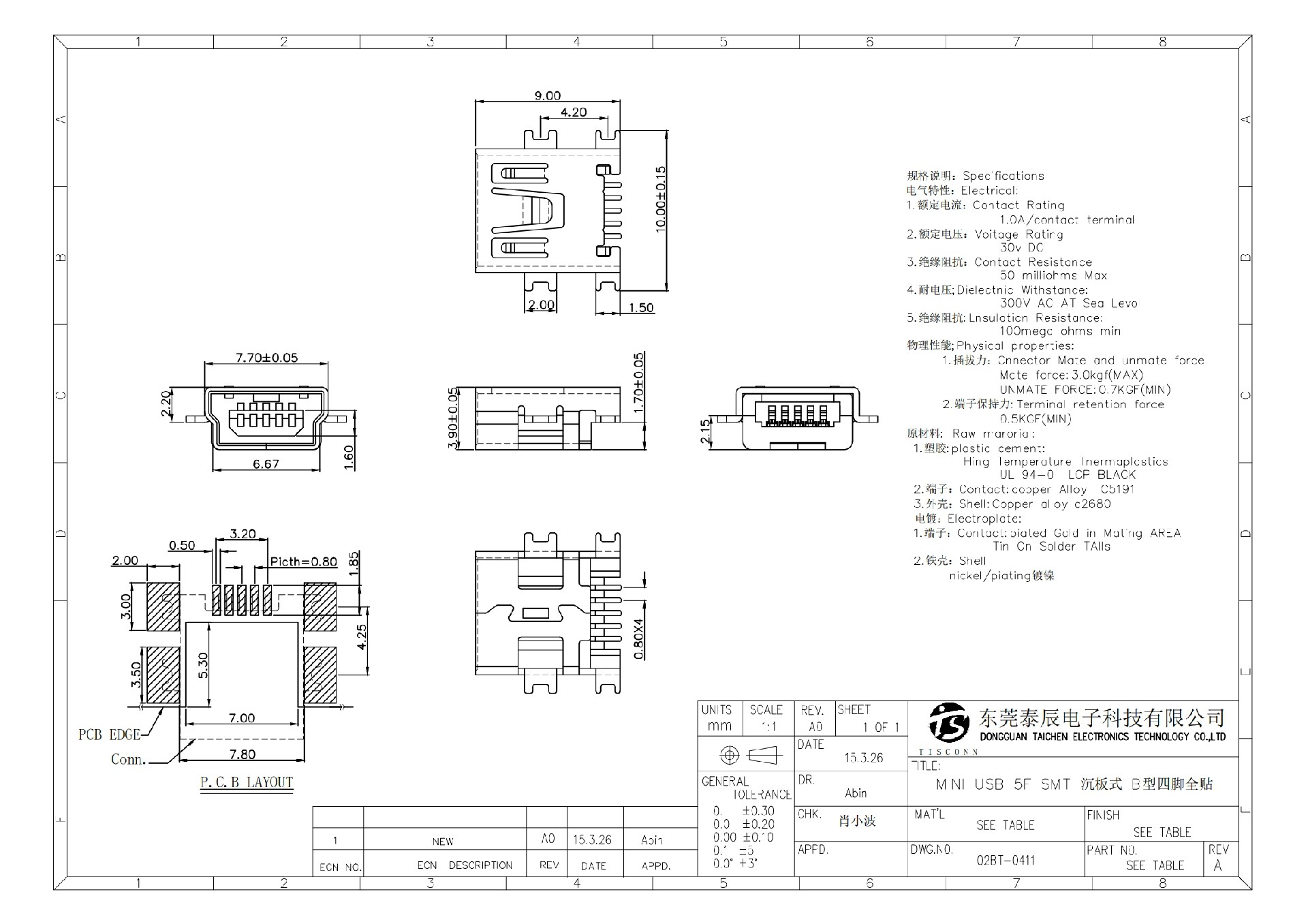 • 02BT-0411 MINI USB 5F SMT 沉板式 B型四脚全贴