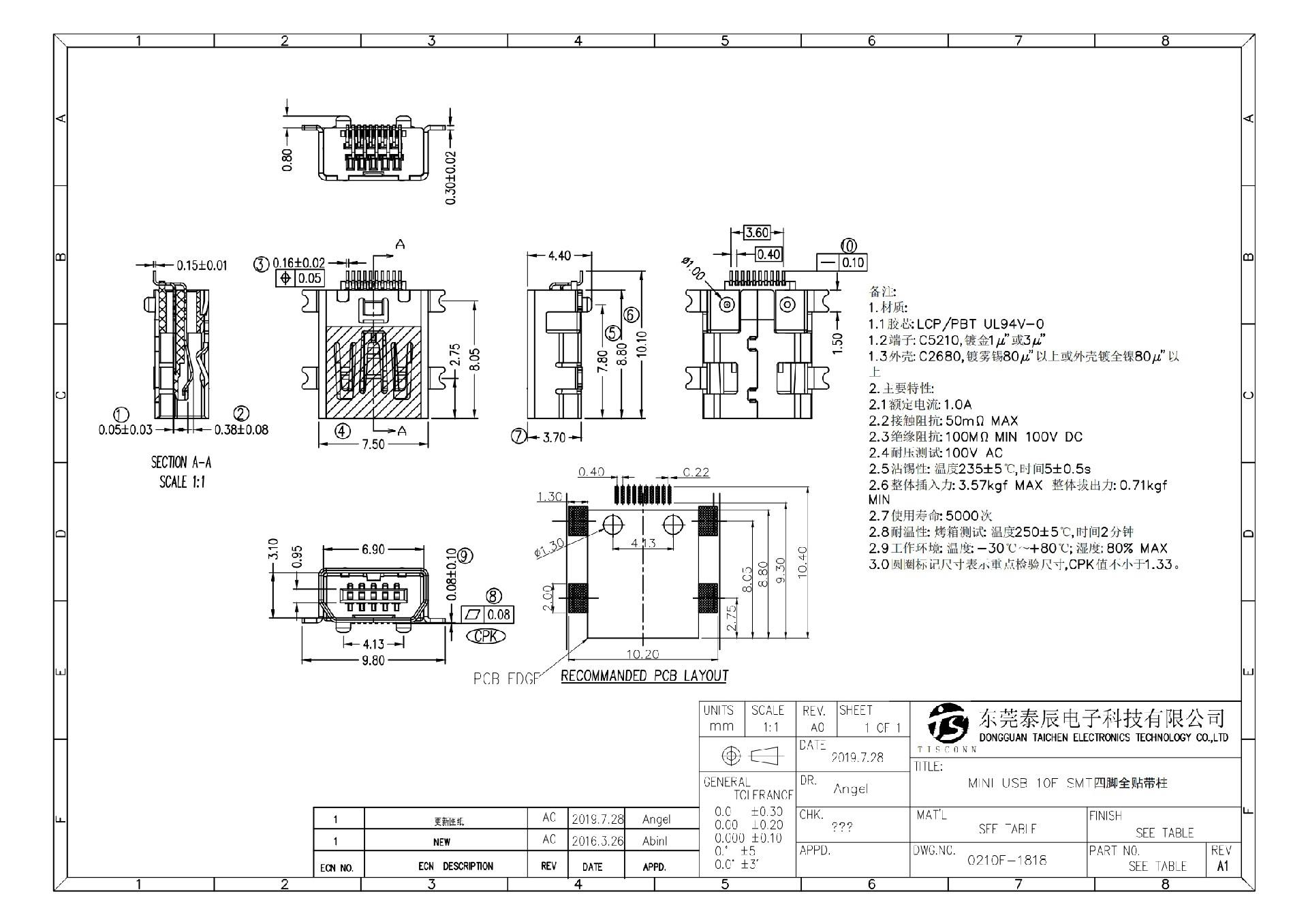 0210F-1818 MINI USB 10F SMT四脚全贴带柱