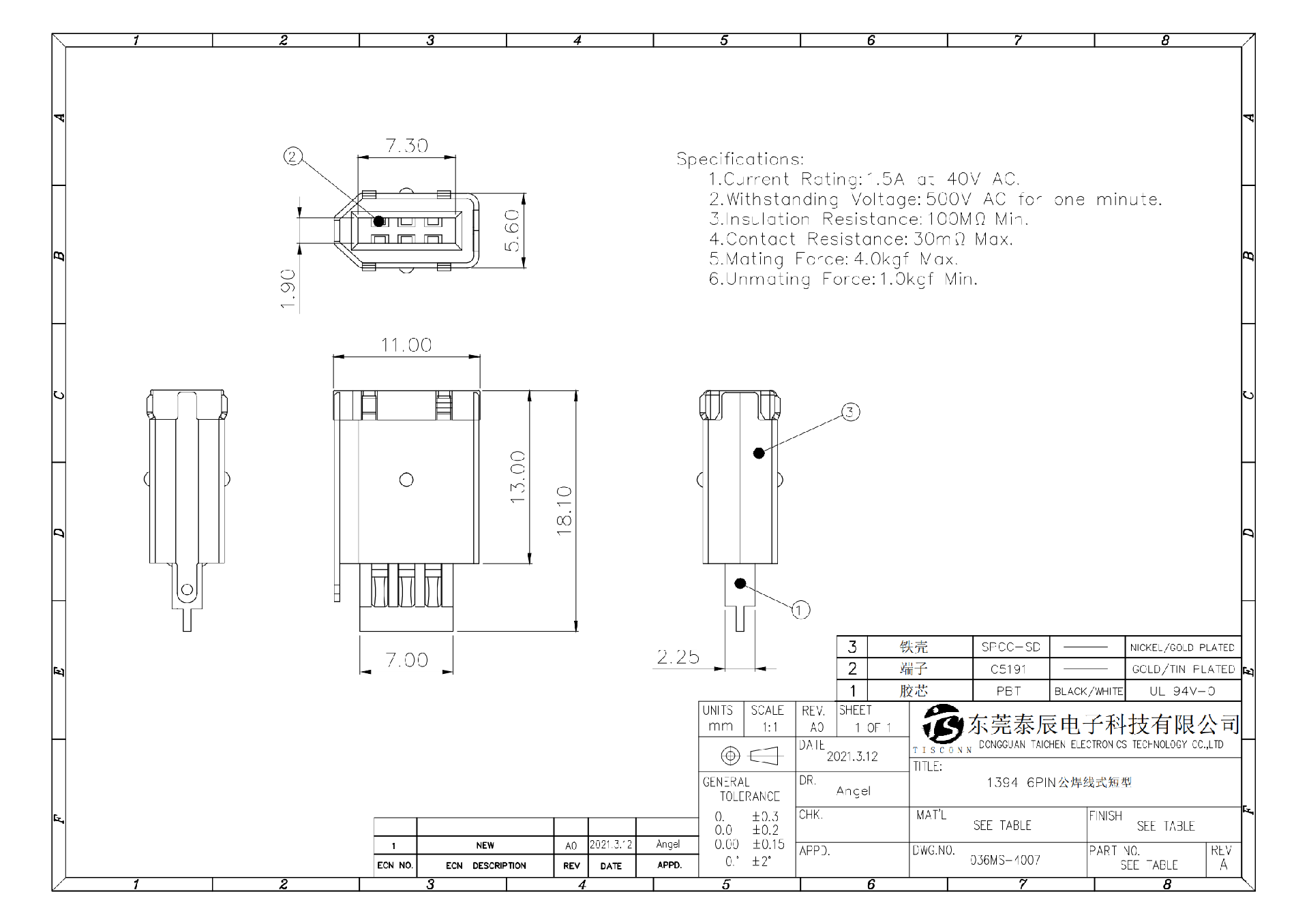 036MS-4007 1394 6PIN公焊线式短型