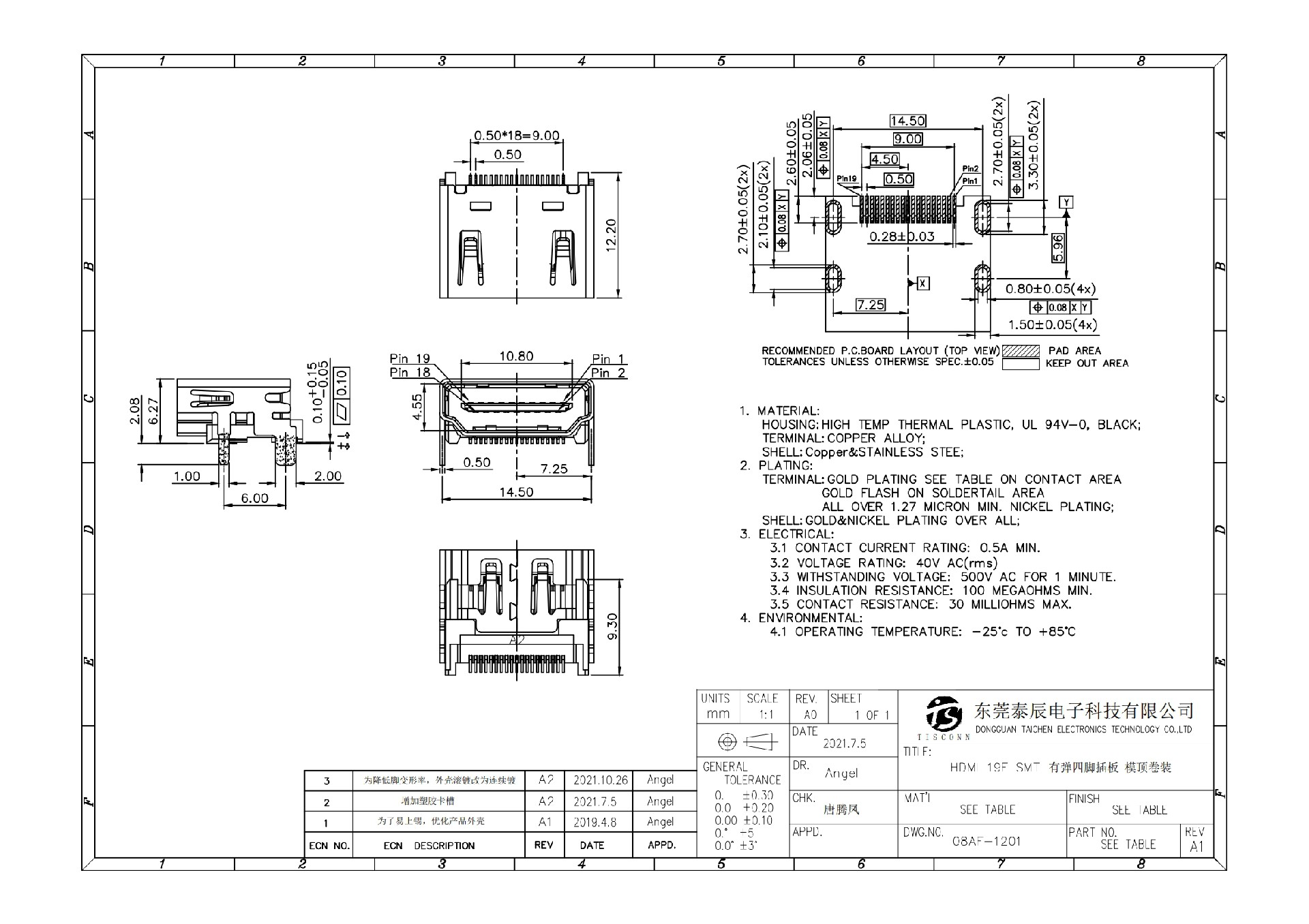 08AT-9215 HDMI 19F SMT 板上四脚插板有弹