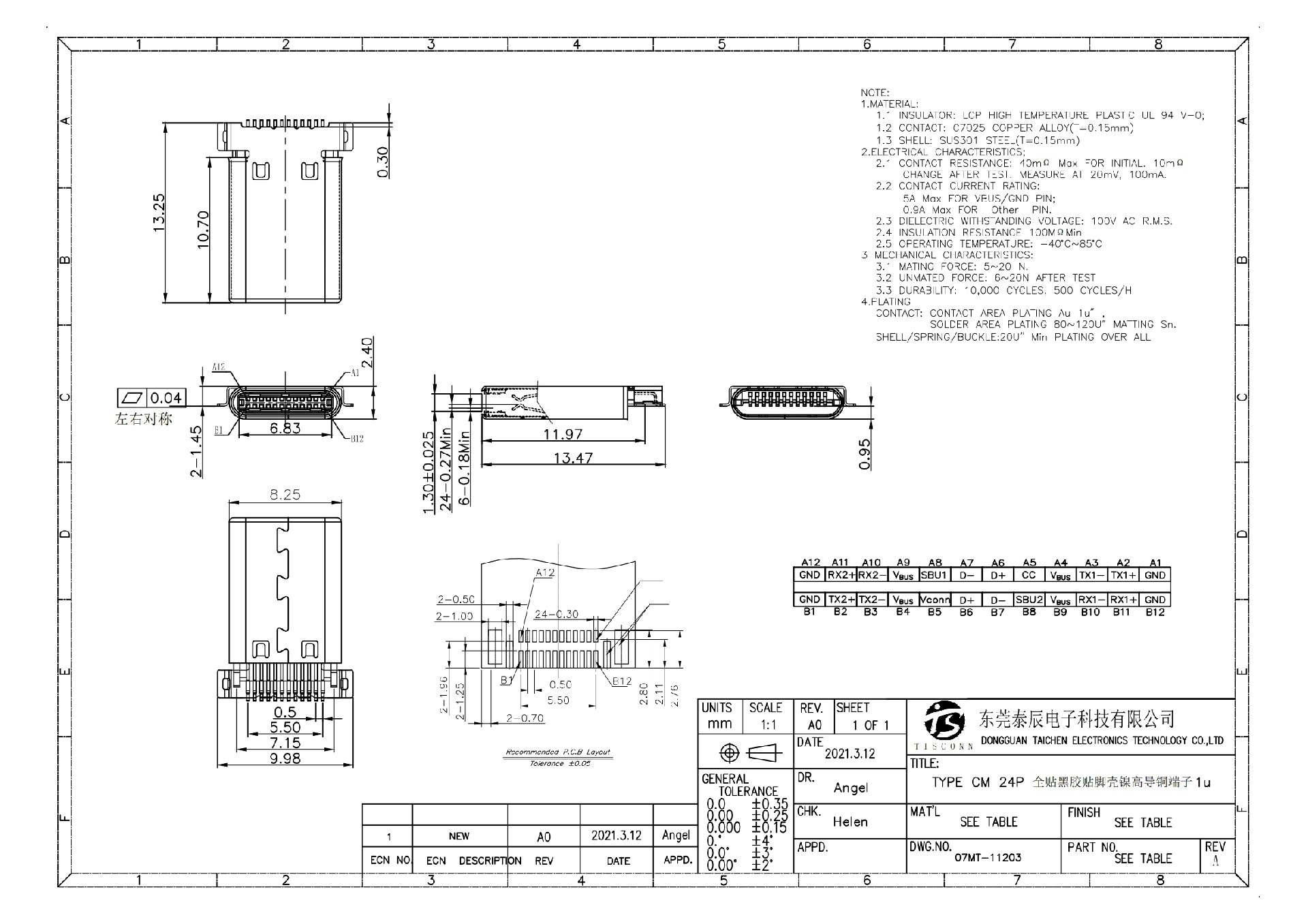07MT-11203 TYPE CM 24P SMT 全贴黑胶贴脚壳镍高导铜端子1u