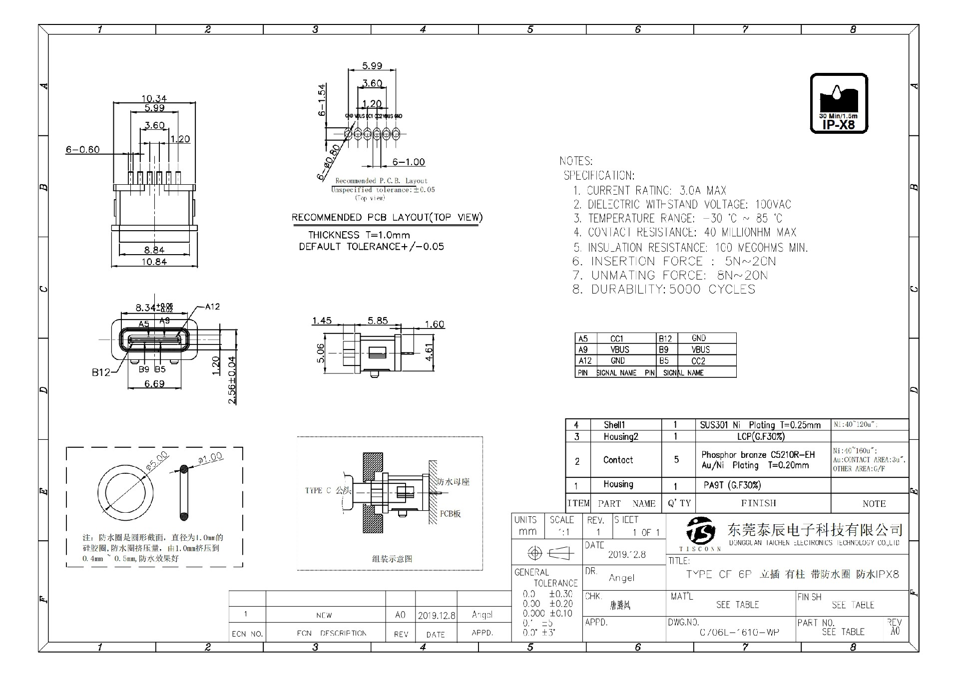 0706L-1610-WP TYPE CF 6P Vertical insertion with column and waterproof ring, waterproof IPX8
