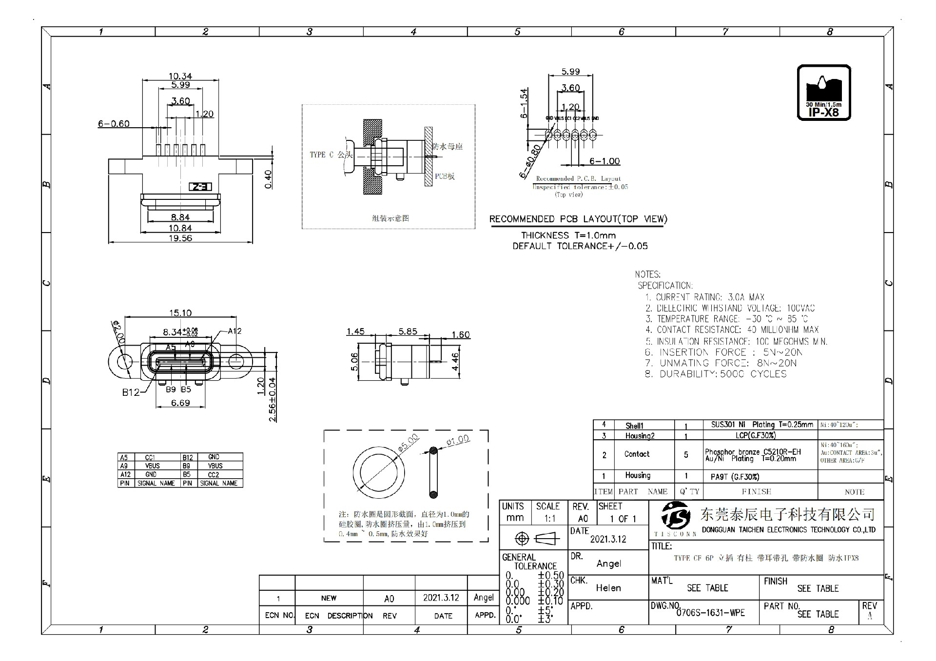 0706S-1631-WPE TYPE CF 6P Vertical insertion with column, ear, hole, waterproof ring, waterproof IPX8
