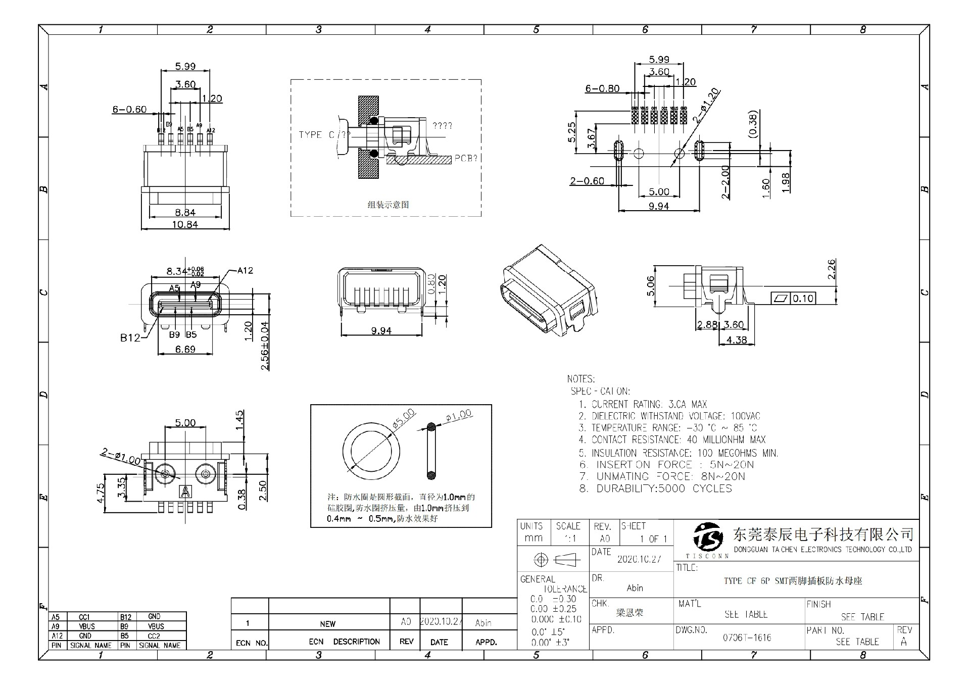 0706T-1616-WP TYPE CF 6P SMT two pin plug-in board with column waterproofing