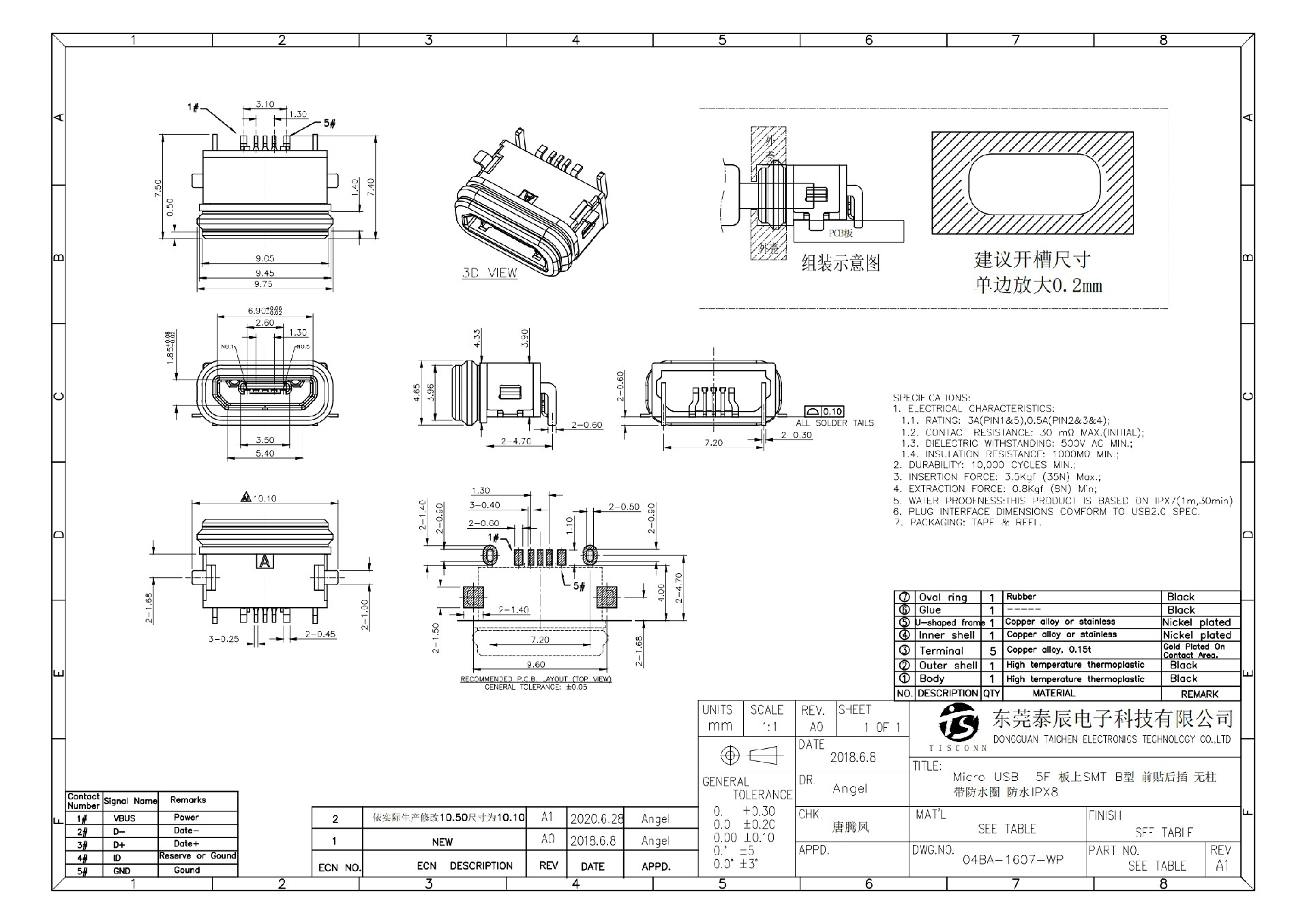 04BA-1607-WP Micro USB 5F SMT B-type on board, front pasted and rear inserted without column, with waterproof ring, waterproof IPX8