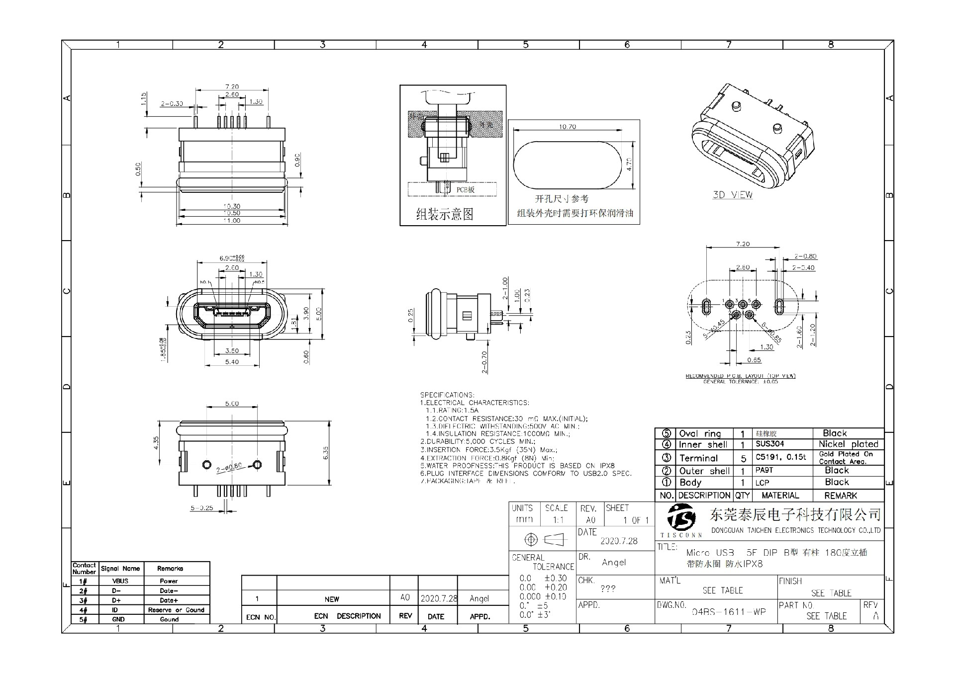 • 04BS-1611-WP   Micro USB  5F DIP B-type column 180 degree vertical insertion with waterproof ring, waterproof IPX8