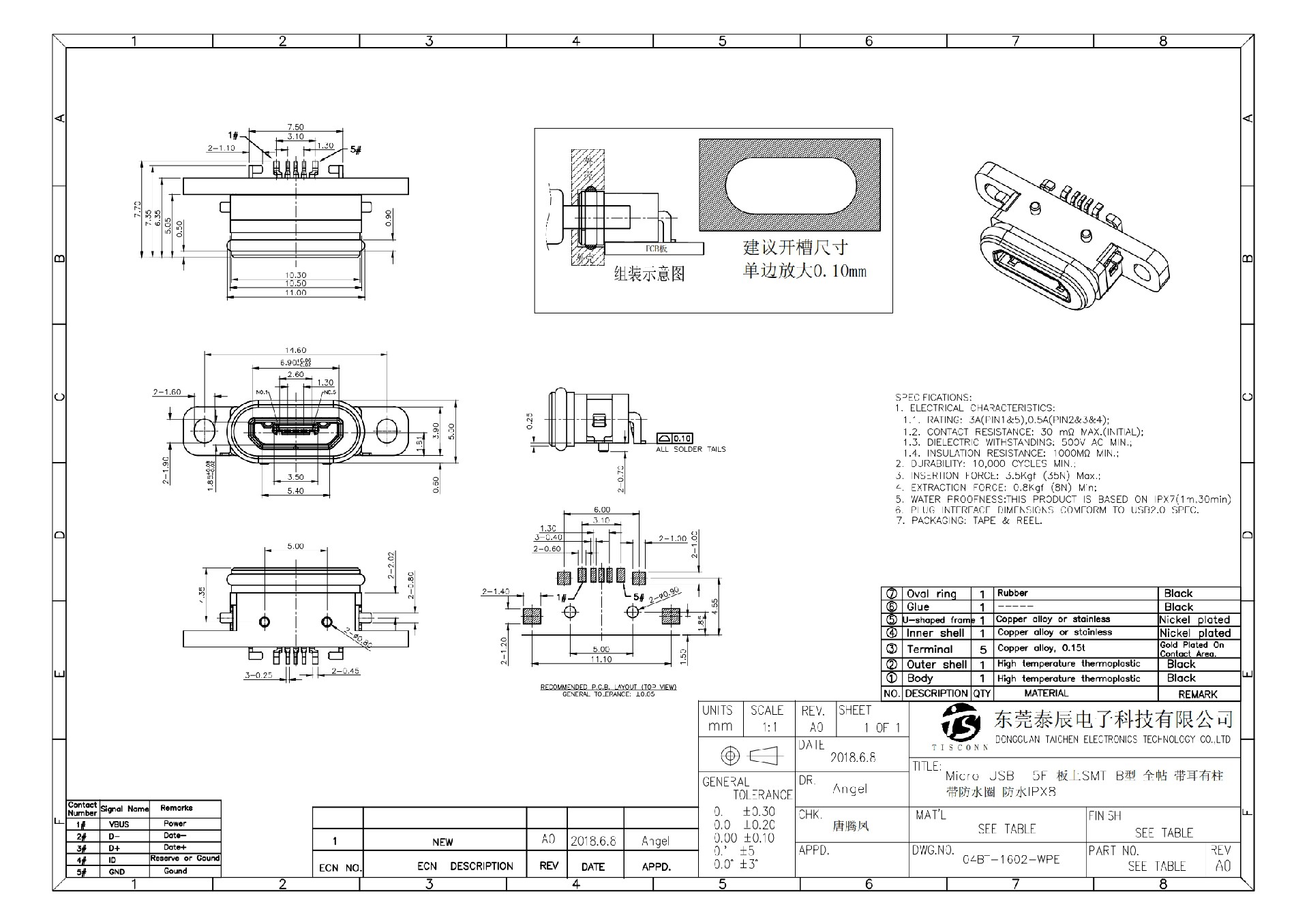 • 04BT-1602-WPE   Micro USB  5F SMT B-type full adhesive with ear, column, waterproof ring, waterproof IPX8 on board