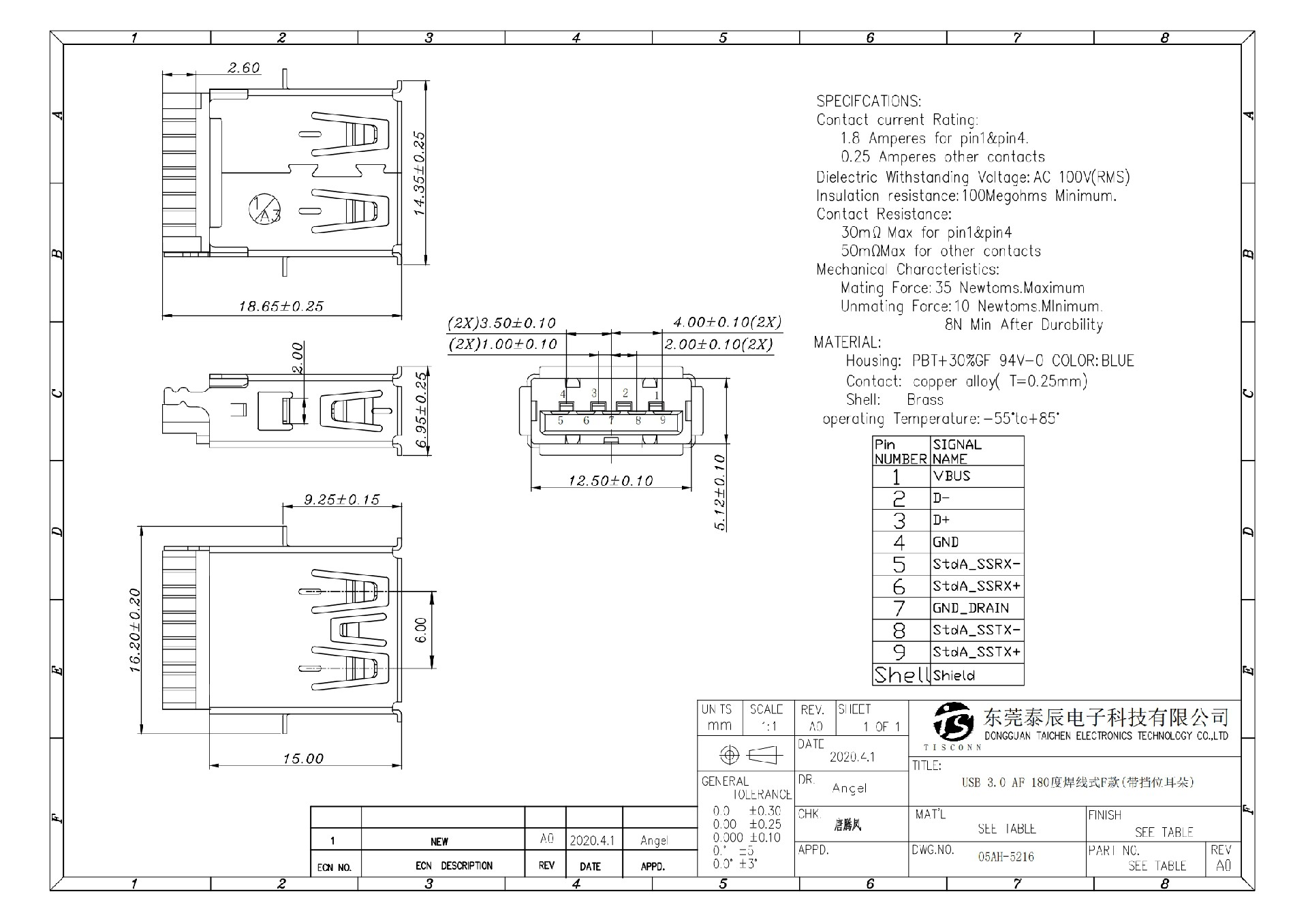 05AH-5216 USB3.0 AF 180 ° soldered F model with rolled edges and shift ears L=18.65