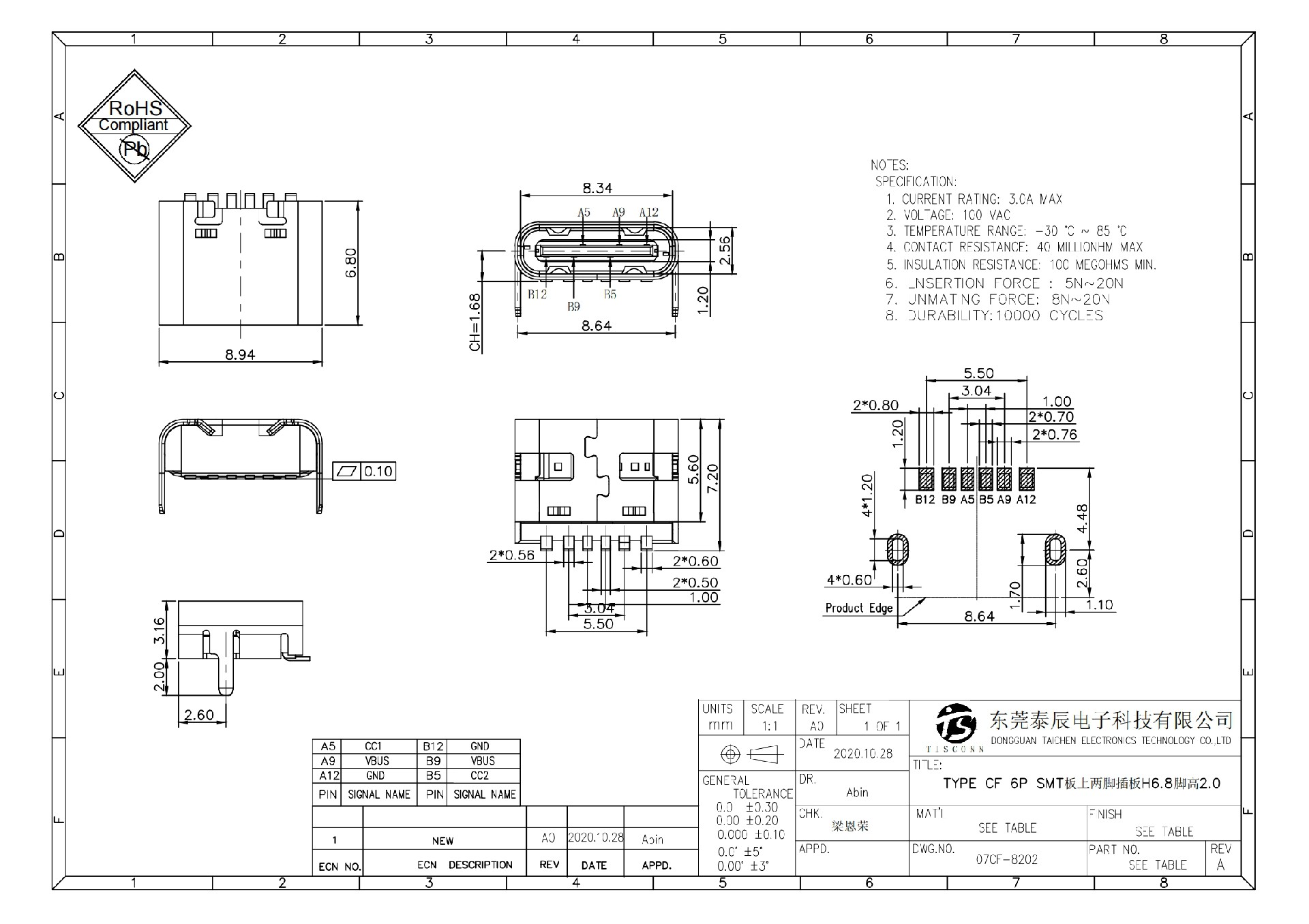 07CF-8202 TYPE CF 6P SMT板上两脚插板H6.8脚高2.0
