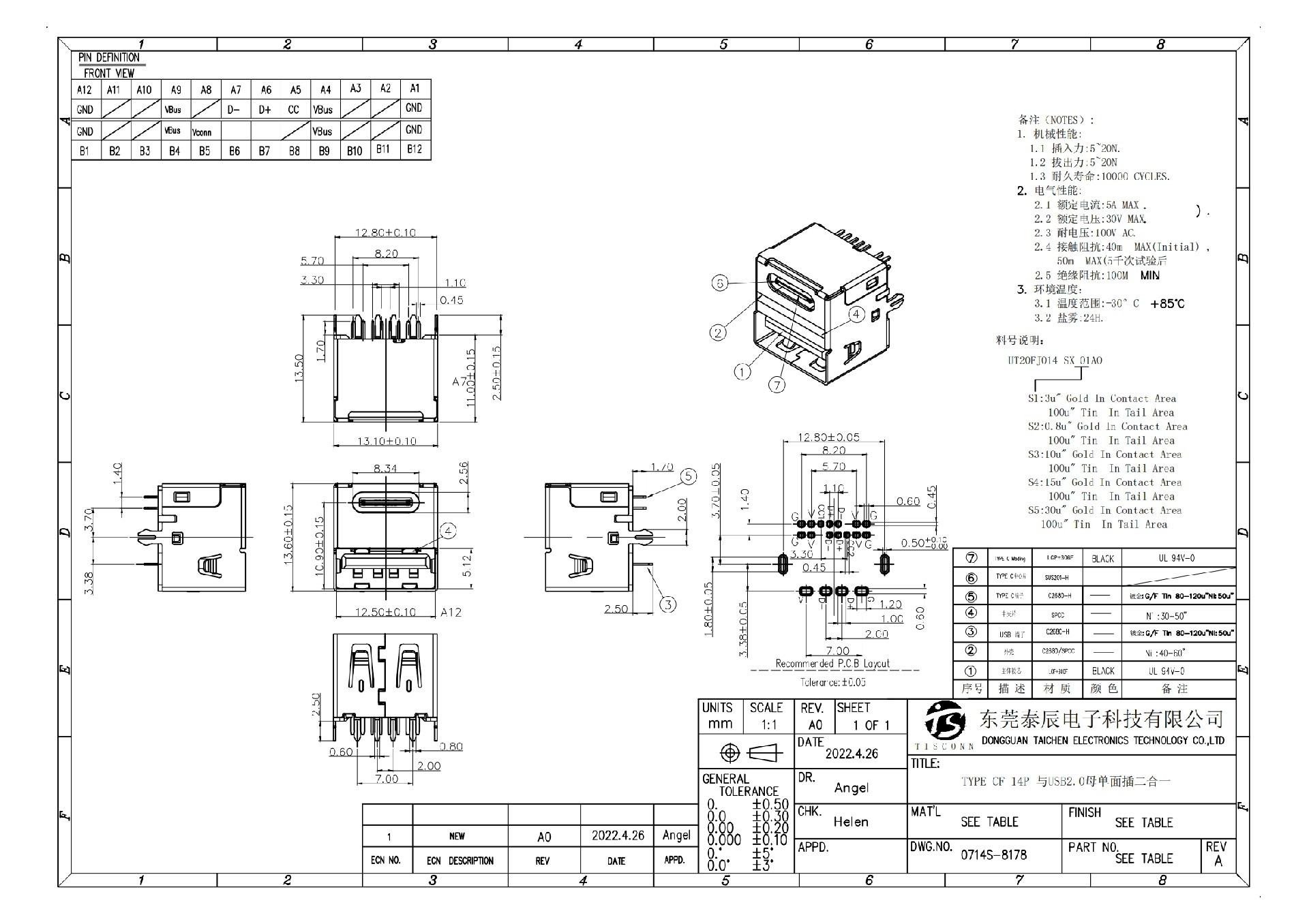 0714S-7407 TYPE CF 14P+USB 2.0 AF One-sided two-in-one 180-degree B