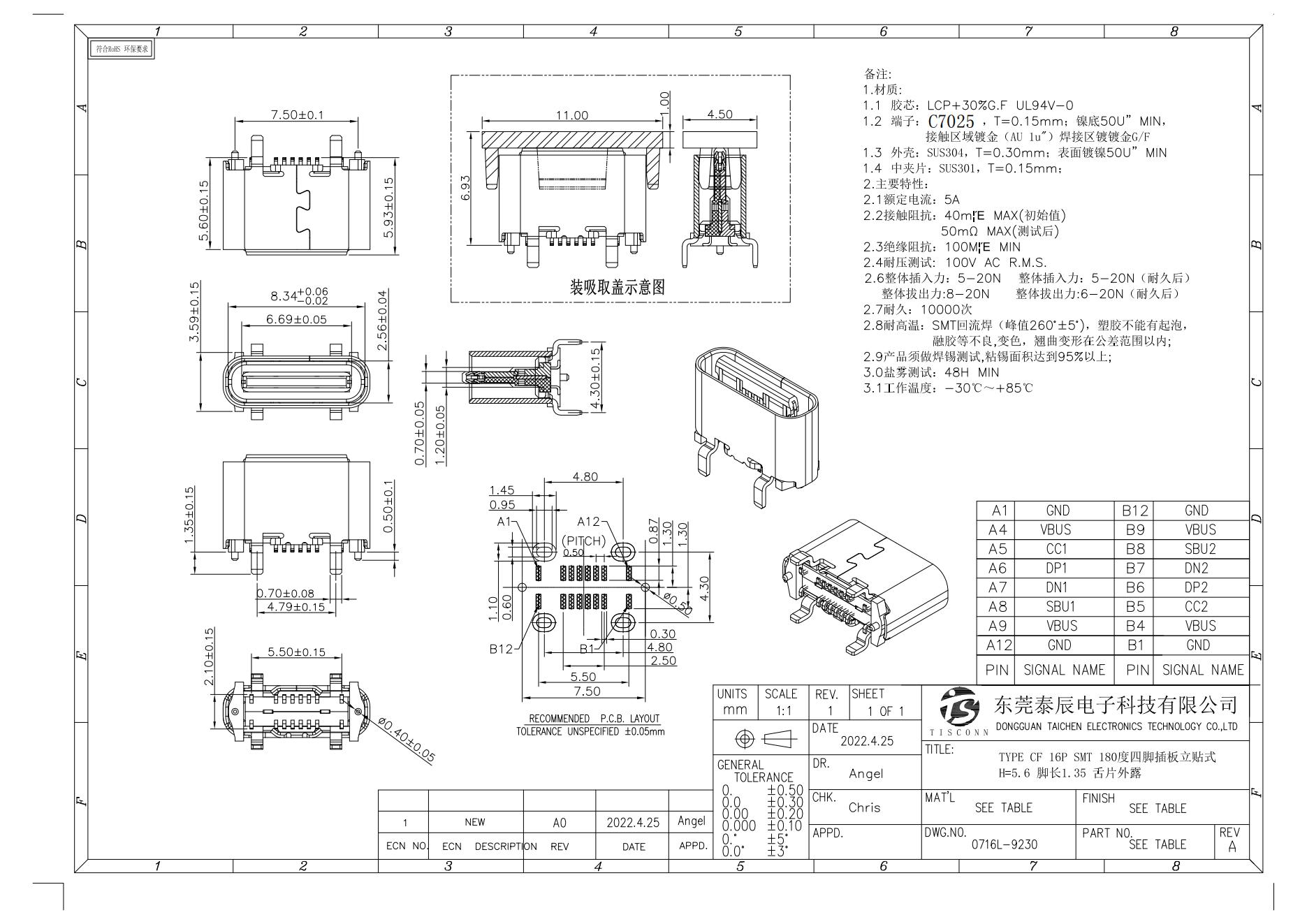 0716L-9230 TYPE CF 16P SMT 180 degree four pin plug-in board vertical mounting H=5.6 foot length 1.35 tongue exposed