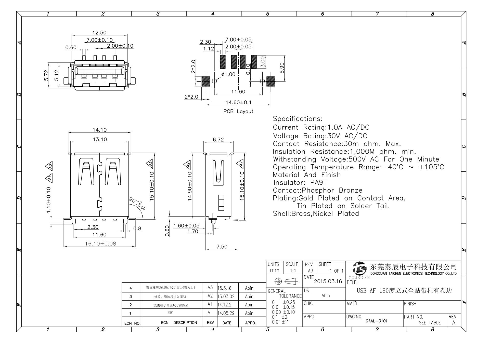 01AL-0101 USB AF SMT 180度立式全贴带柱有卷边