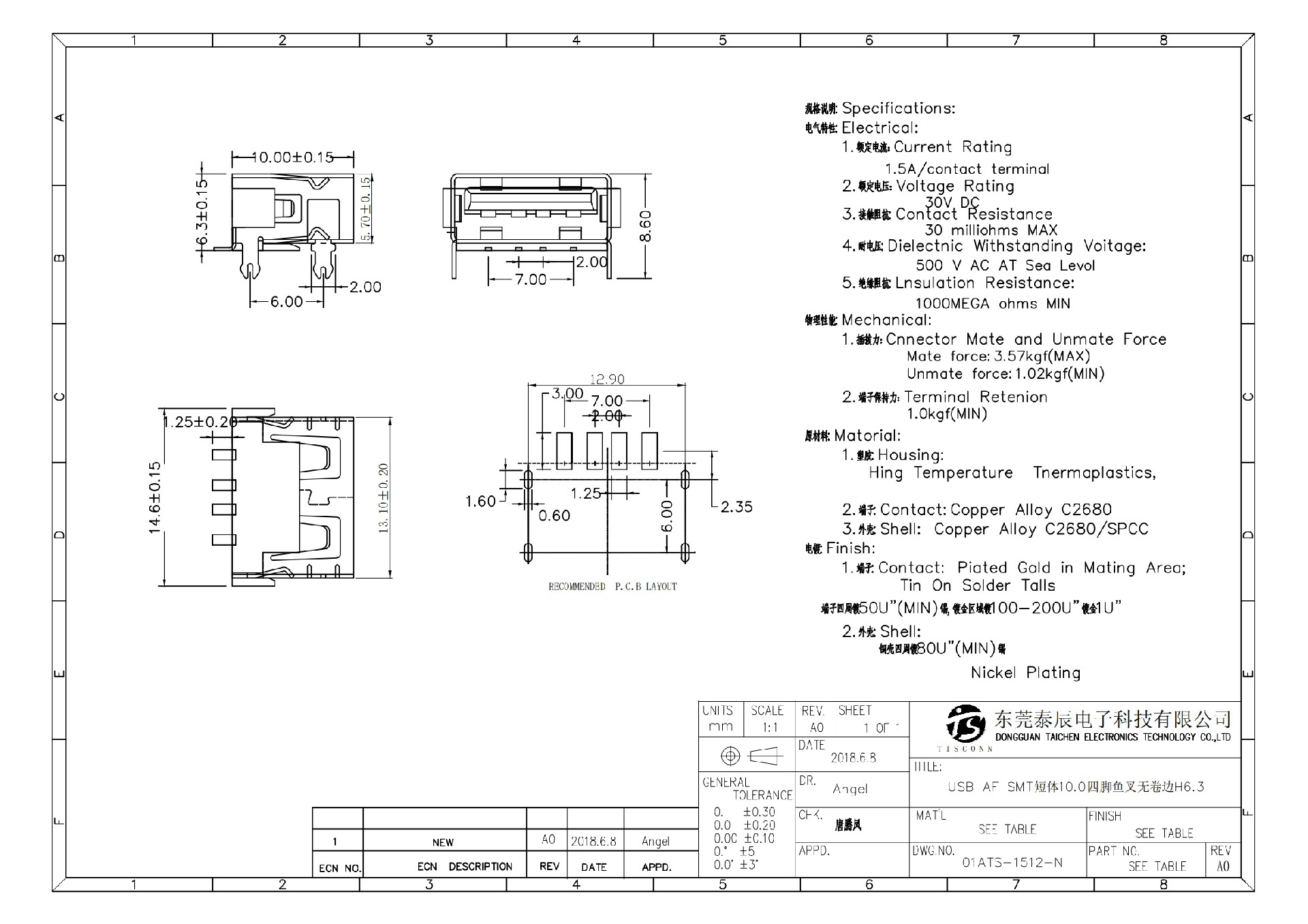 • 01ATS-1512-N USB AF SMT短体10.0四脚鱼叉无卷边H6.3
