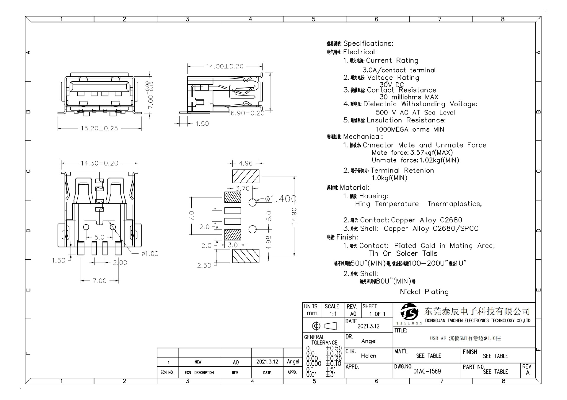 01AC-1569 USB AF 沉板SMT有卷边∅1.0柱 大电流