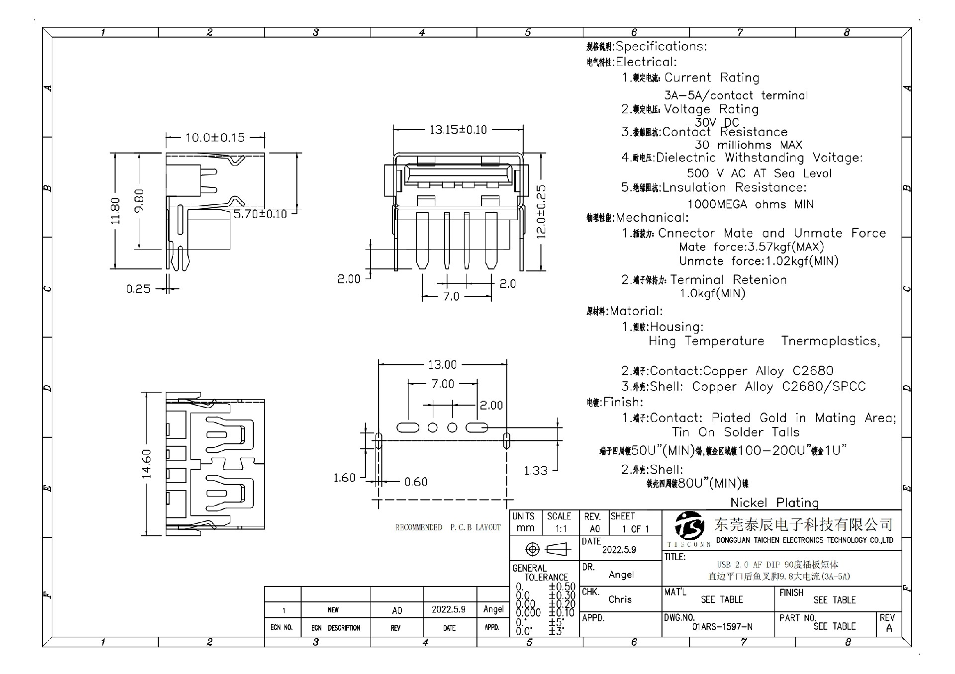 01ARS-1597-N USB 2.0 AF DIP 90度插板短体直边平口后鱼叉脚9.8大电流(3A-5A)